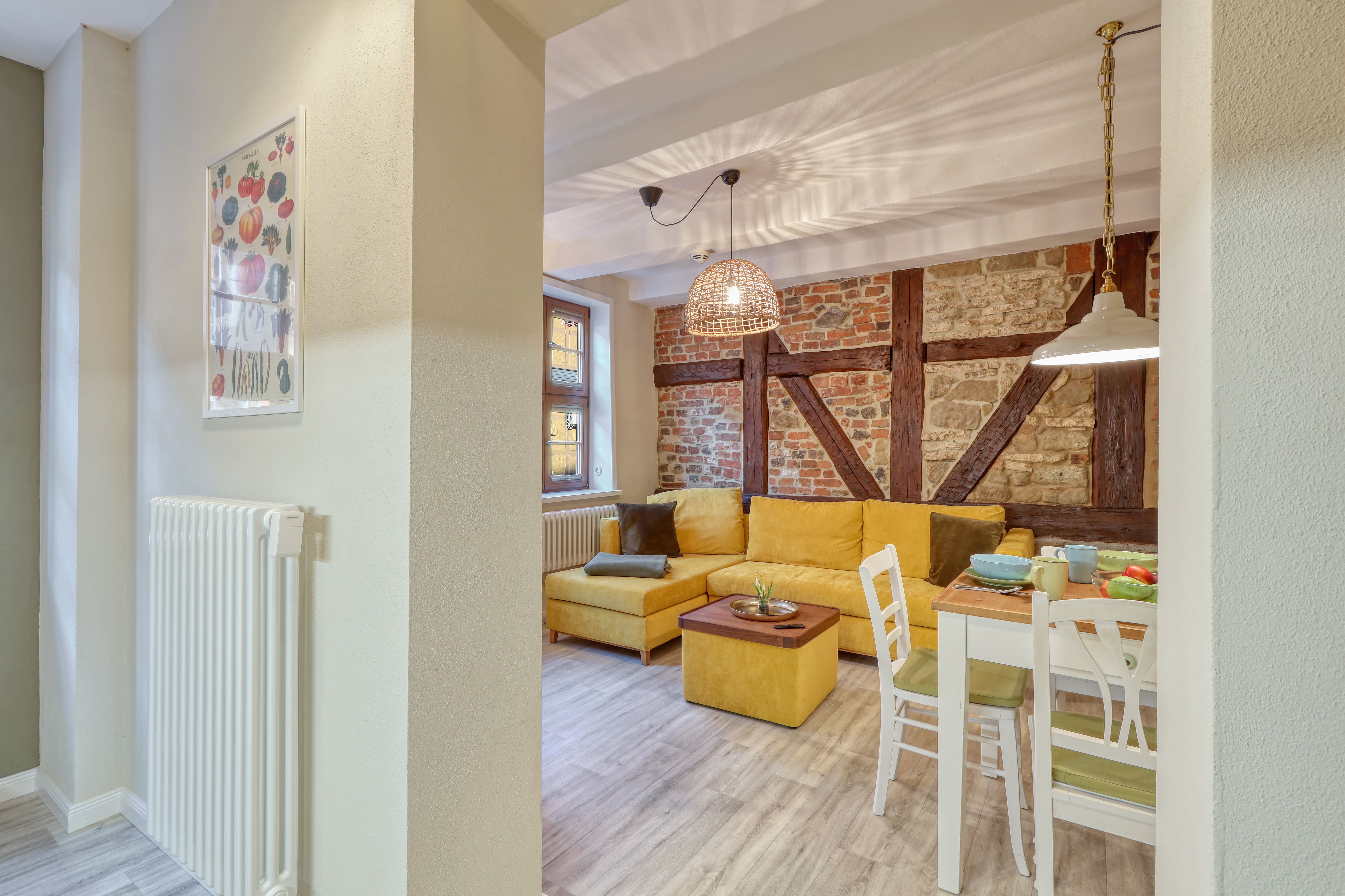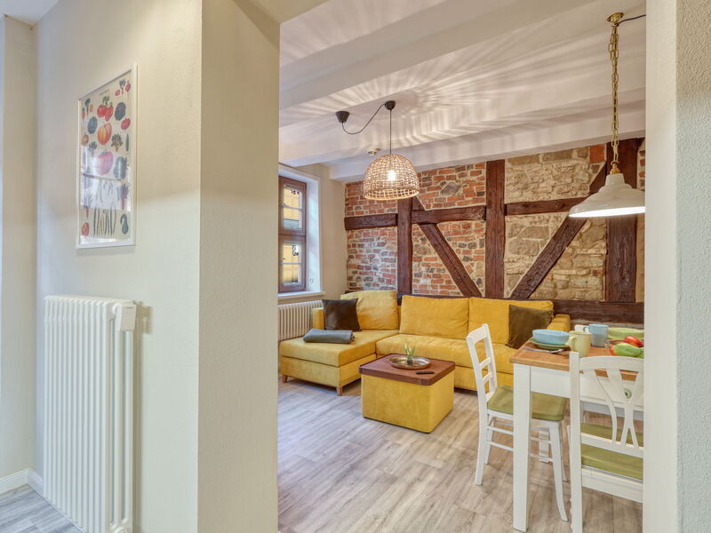 The half-timbered house at Steinweg 61 in Quedlinburg is an outstanding example of Germany's traditional craftsmanship in timber framing. As part of the UNESCO World Heritage site "Old Town of Quedlinburg," this historic building is distinguished by its authentic architecture and meticulous restoration, which has preserved its original charm. Guests and timber-frame enthusiasts alike are captivated by the artistic design of the façade, the elaborate wooden decorations, and the historically rich atmosphere. The house at Steinweg 61 symbolizes Quedlinburg's rich cultural heritage—making it all the more valuable that it now offers high-quality vacation apartments in the heart of Quedlinburg. Discover the unique beauty and historical significance of this architectural masterpiece and stay in the center of Quedlinburg.